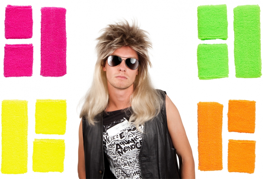 80er Jahre Vokuhila Perücke (ohne Sonnenbrille) und Schweißband Stirnband Set, 4 Neon Farben wählbar, z.B. pink grün orange oder gelb. Ob als Karnevalverkleidung oder zur achtziger Jahre Themen und Mottoparty, so sind Sie bestens im Stil der 80er verkleidet. Material Schweißbänder und Vokuhilaperücke: 100% Polyester