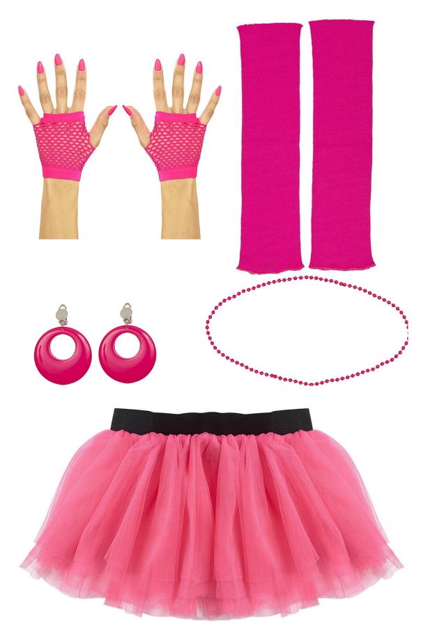 80er Jahre Out-Fit in den Farben neon-pink gehalten. Die Knallerfarben der 80er. Bestehend aus 8 Teilen. Ein Tutu (Rock) + 2 Netzhandschuhe wahlweise in kurz oder lang, + 2 Ohrringe, + 2 Stulpen und eine Perlenkette. Komplett ausgestattet für die nächste Motto / Schlagerparty.
