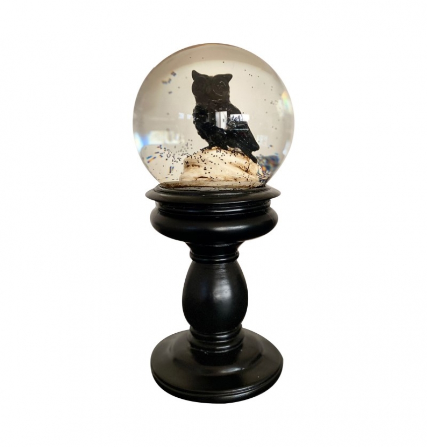 - Wasserkugel: Die klare Glaskugel umschließt eine detailreiche Eule, die auf einer Art Stein thront. Die Eule ist in einer düsteren, aber faszinierenden schwarzen Farbe gehalten, die perfekt zur Halloween-Atmosphäre passt. Partikel schweben in der Flüssigkeit, die bei Bewegung der Kugel einen schaurig-schönen Effekt erzeugen.