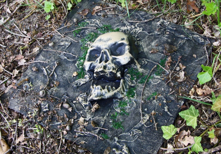 Diese Matte aus grobem Stoff sorgt mit ihrem dreidimensionalen Schädel für einen gruseligen Effekt. Ideal, um mit Laub bedeckt auf Gras oder Erde platziert zu werden – so wirkt es, als würde der Schädel direkt aus dem Boden brechen. Alternativ kann die Matte auch als Wanddekoration verwendet werden.