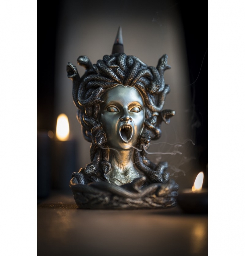 Medusa-Dekofigur Räucherbrunnen aus Polyresin (Kunstharz) mit den Maßen 13 cm x 13 cm x 18,5 cm. Die Figur zeigt Medusa, eine Gestalt aus der griechischen Mythologie, mit Schlangen als Haaren und einem schreienden Gesichtsausdruck. Solche Rückfluss-Räucherbrunnen sind so konzipiert, dass der Rauch nach unten fließt, was einen faszinierenden visuellen Effekt erzeugt. Der Rauch scheint dabei wie Wasser die Struktur hinunterzufließen, was besonders in Kombination mit dem detailreichen Design der Medusa sehr beeindruckend wirken kann.