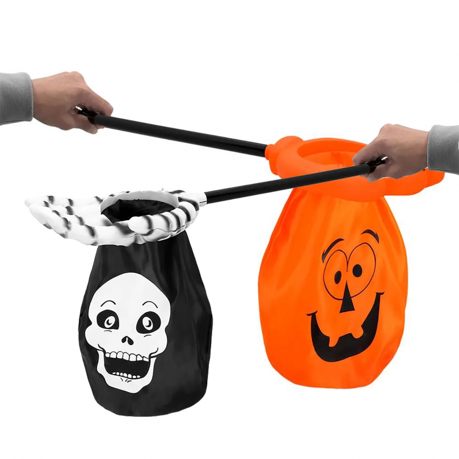 Süßigkeiten wie Bonbons, Gummibärchen, Lakritz, Kaugummi und Kekse lassen sich hervorragend mit dieser Sammeltasche mit dem Halloweenmotiv Kürbis oder Totenkopf einsammeln.