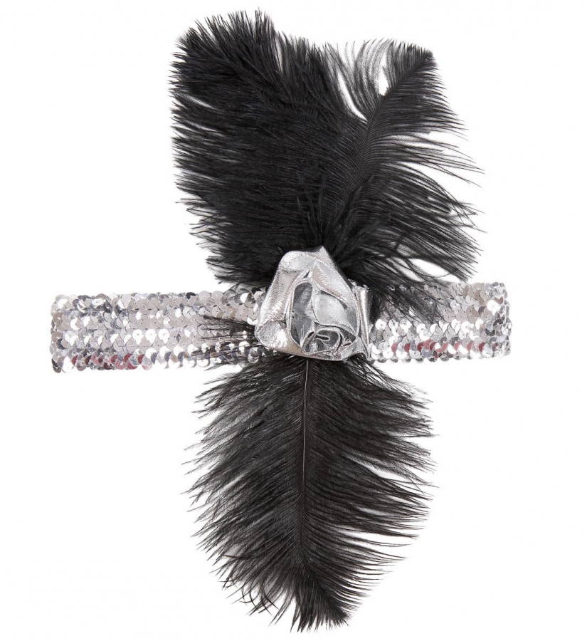 Charlestonstirnband mit großer Feder und Paillettenbesatz.