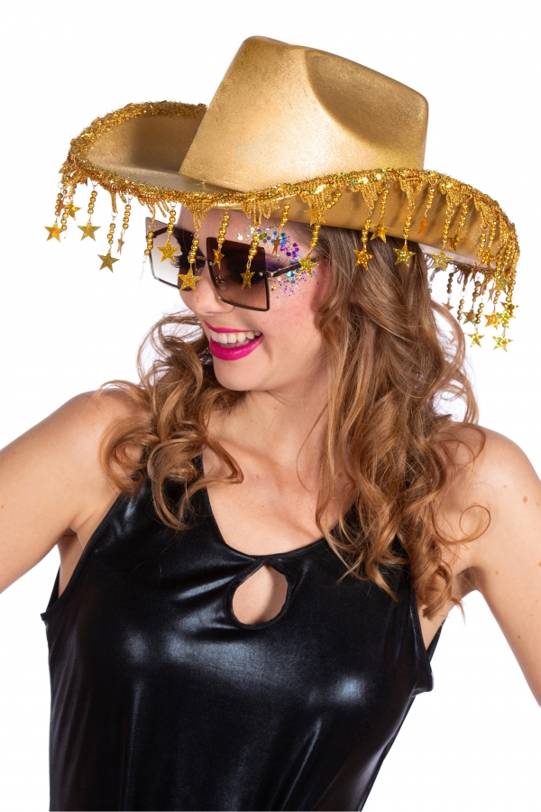 Auffälliger Look: Mit seinem Gold-Design und Sternchen zieht dieser Cowboyhut alle Blicke auf sich – perfekt für Festivals, Technopartys und besondere Events.