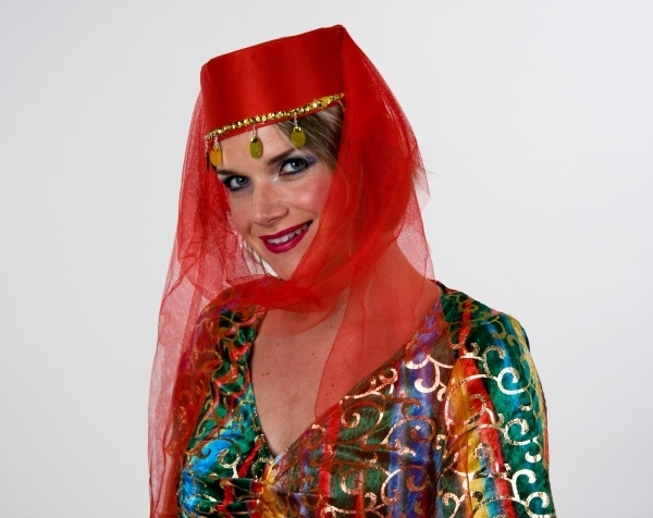 Hübsche Haremskappe mit Schleier für die Dame. Toll zu Ihrem Bauchtänzerinnen Kostüm kombinierbar. Dieser Kopfschmuck gehört einfach dazu und komplettiert Ihr Outfit. Wie ein Traum aus 1001 Nacht. Material: 100% Polyester.