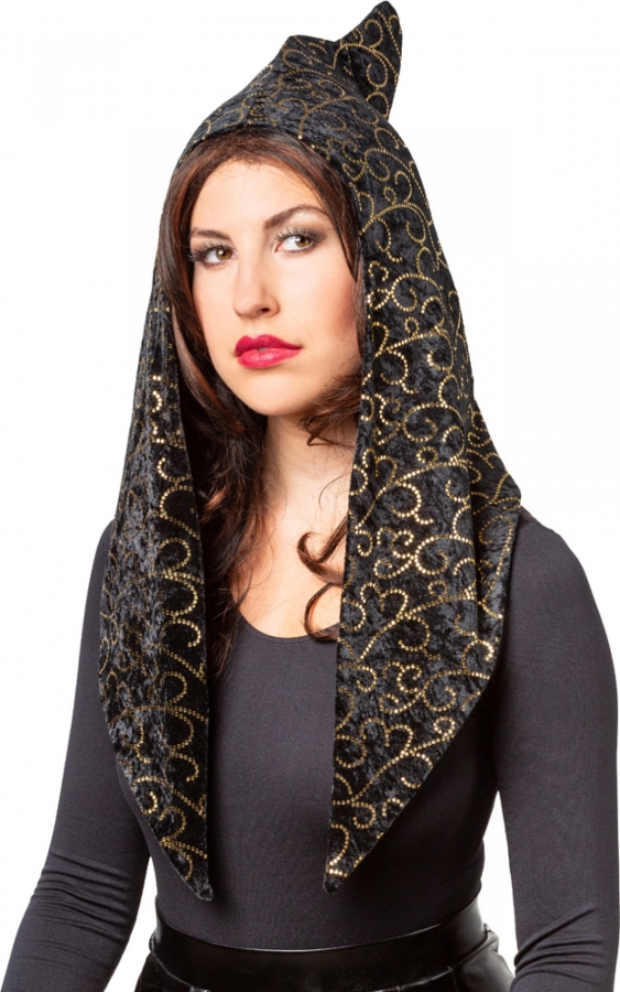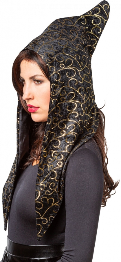 Gold-schwarz gehaltene Samtkapuze mit Innenfutter.