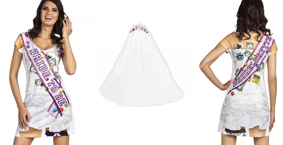 Tolles Out-Fit zum Junggesellinenabschied. Set besteht aus einem aufreizendem T-Shirt (Fotorealistisch, 3D-Effekt) und einem Diadem mit Schleier. Die Party der Braut kann steigen. Lieferbar in den Größen S, M oder L. Beidseitig bedruckt.