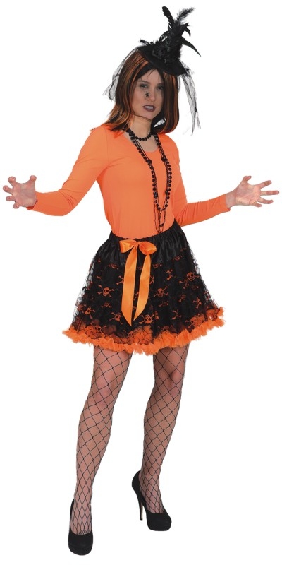 Die Grundfarbe ist schwarz. Auf dem Pettiskirt sind orangefarbene Totenköpfe abgebildet.