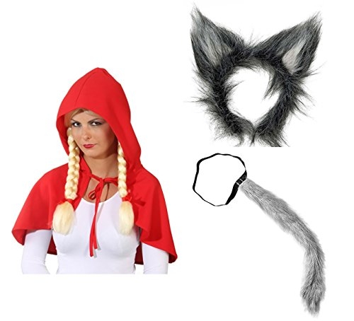Rotkäppchen Cape Umhang mit passendem Wolf-Set. Das Wolfset besteht aus einem Haarreifen und Schwanz der mit einem Gummiband wie ein Gürtel getragen werden kann.