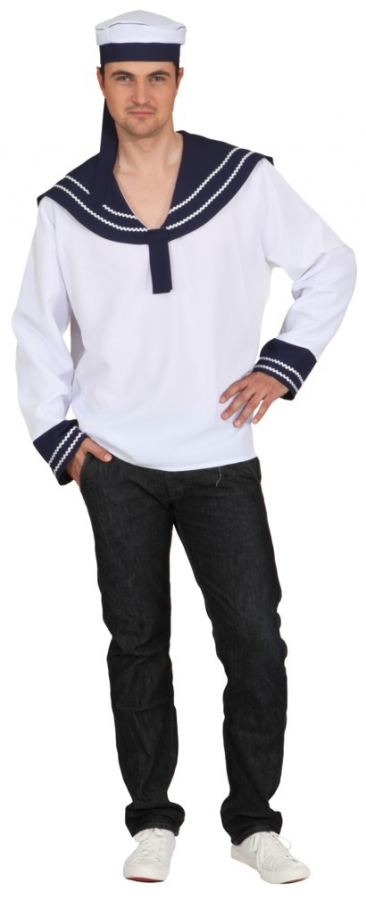 Tolles Marine Outfit für den Herren. Der Seefahrer Look besteht aus Matrosenhemd und einer Matrosenmütze. Der Seemann kommt ganz typisch in blau/Weiß daher. Ein großer, dunkelblauer Kragen an dem weißen Hemd ist ganz typisch für den Seemann. Sie können das Matrosenkostüm in den Größen 46/48, 50/52 oder 54/56 wählen. Material: 100% Polyester.