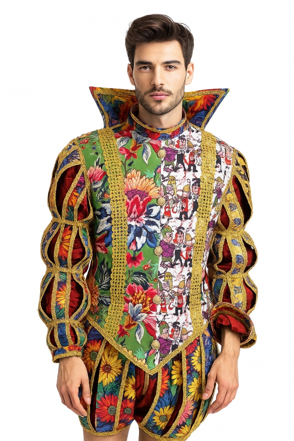 Prinzenkostüm de Luxe Patchwork für Herren – ein auffälliges Karnevalkostüm im prunkvollen Barock-/Renaissance-Stil mit edler Ausstrahlung. Das hochwertige Garde- und Prinzenkostüm begeistert durch sein farbenstarkes Patchwork-Design mit floralen und dekorativen Motiven sowie goldfarbenen Borten und Zierdetails – ideal für Fasching, Karneval, Gardetanz, Motto-Partys, Bühne und Umzüge.