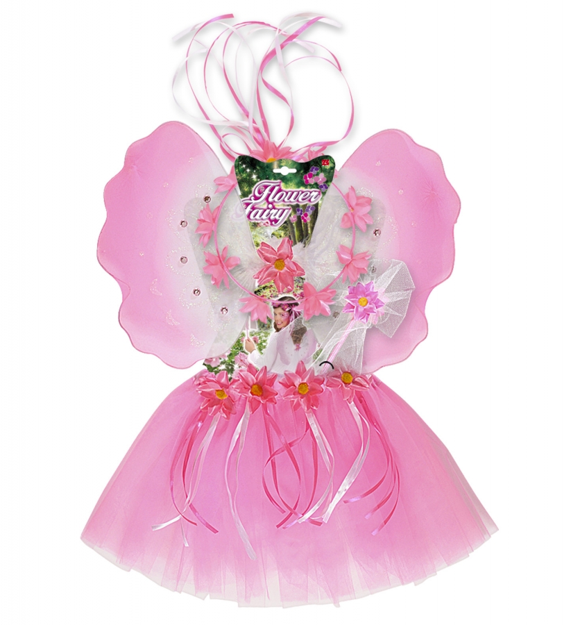 Blumenhaarkranz, Zauberstab, Tütü und rosa Flügel.