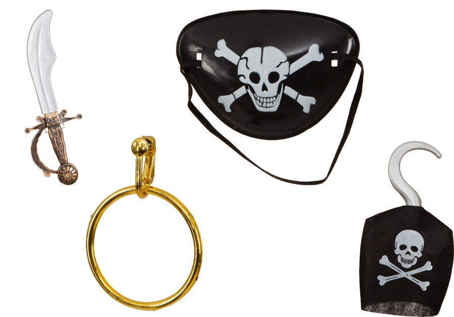 Piraten-Set für Kinder. Augenklappe, Ohrring, Schwert und Haken.