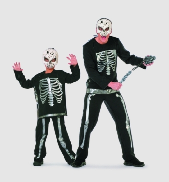 Das Kostüm besteht aus Hose und Oberteil. Die beiden Teile sind schwarz mit einem abgebildeten Knochen-Skelett.
