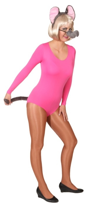 Dieses 3-teilige Elefant-Set besteht aus Haarreif mit großen Ohren, die innen rosafarben und außen grau gearbeitet sind, einem grauen Rüssel sowie einem grauen Schwanz.
