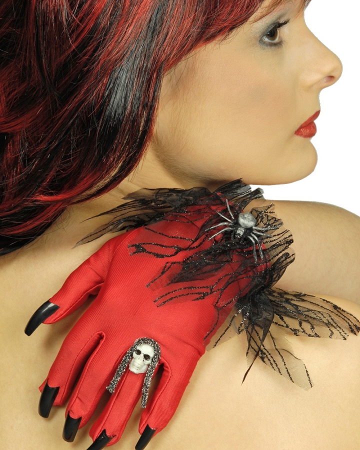 Hexenkrallenhandschuhe schwarz, Teufelskrallen rot. Tolle Handschuhe. Preis gilt für ein Modell. Lieferumfang: 1 Paar Handschuhe (ohne Ring). Wahlweise in rot oder schwarz.Material: 100%Polyester