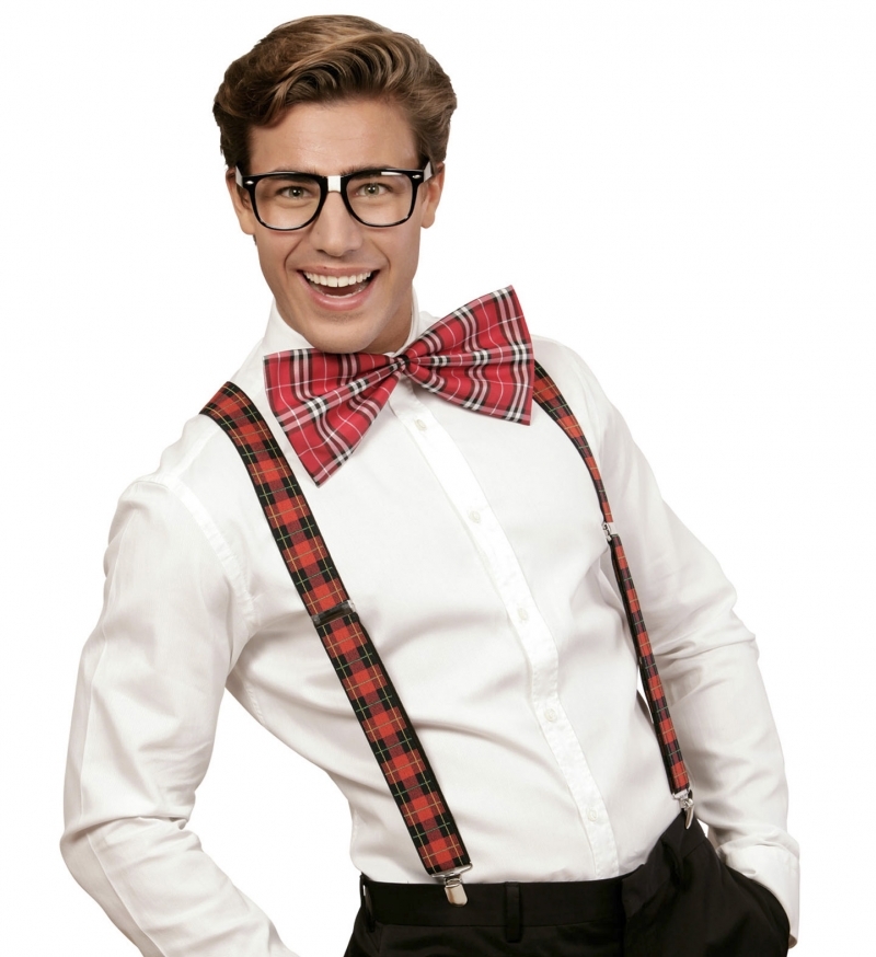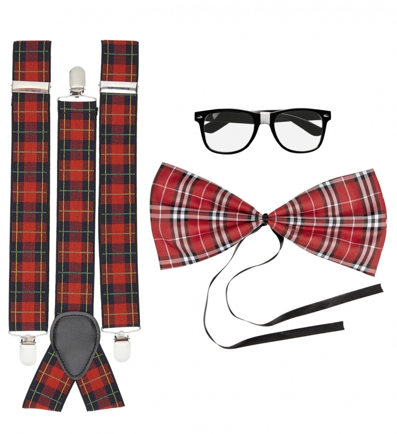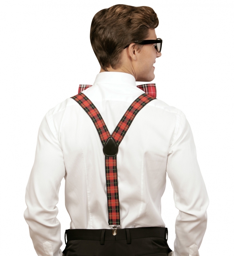 Bestehend aus Hosenträger, Brille und Karofliege.