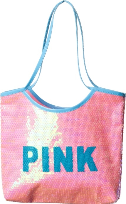 Auf der pinken Paillettentasche ist mit blauen Pailletten der Schriftzug "Pink" angebracht.
