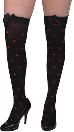 Diese hübschen Überkniestrümpfe sind schwarz und mit roten Herzchen bedruckt.