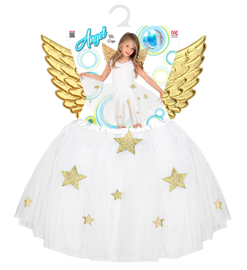 Bestehend aus einem Tutu / Tütu mit Gummizug, verziert mit goldenen Glitzersternen und goldenen Engelsflügel.