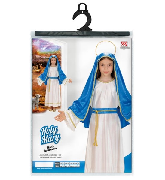 Maria / Maria-Kinderkostüm. Oft genutzt zur Aufführung in der Weihnachtszeit / Krippenspiel. Lieferbar in den Größen 116 (4-5 Jahre), 128 (5-7 Jahre) oder 140 (8-10 Jahre). Lieferumfang: Kleid, Gürtel, Kopfbedeckung und Heiligenschein.